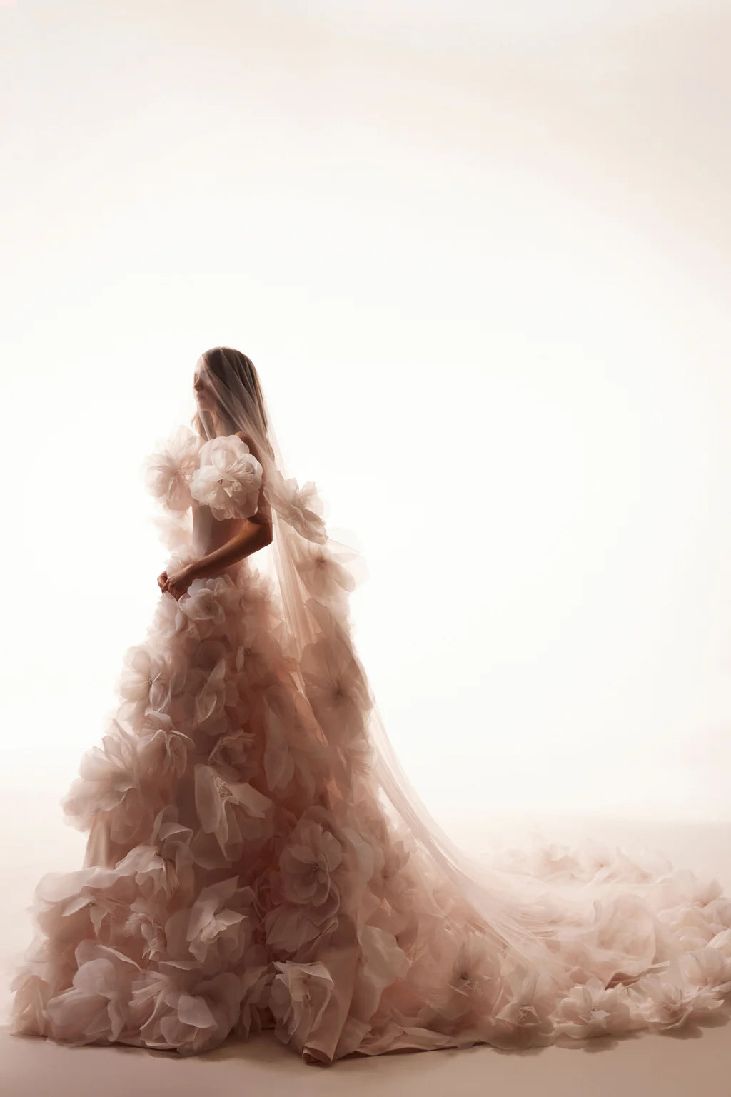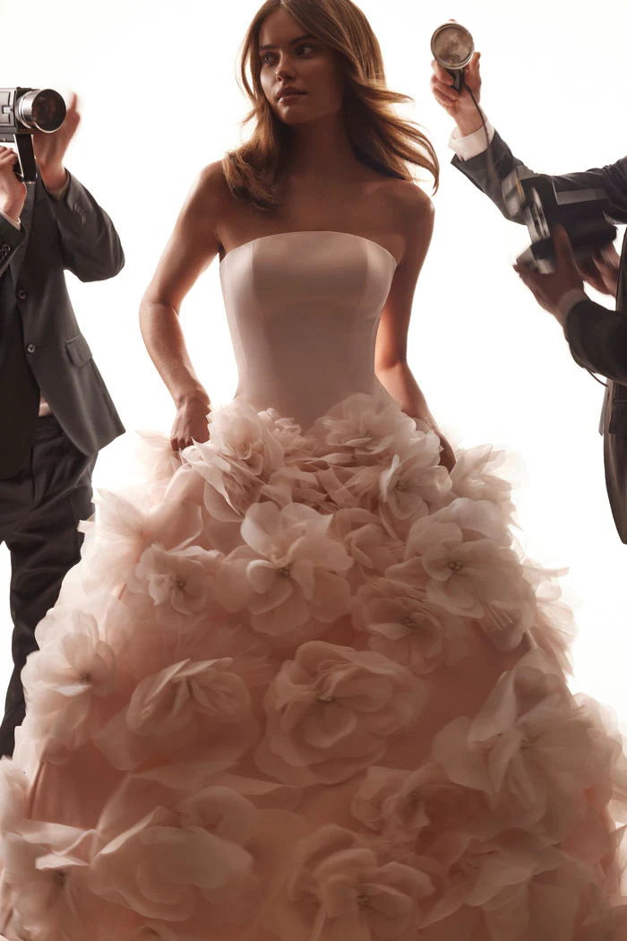 Ein wunderschönes, puderfarbenes Brautkleid ist vollständig mit handgefertigten Blumen verziert. Das Kleid mit asymmetrischem Oberteil ist aus mattem Satin gefertigt. Es verfügt über einen Reißverschluss sowie eine innenliegende Schnürung. Der Rock ist von Hand mit dreidimensionalen Blumen aus Organza und Mesh bestickt, die mit Perlen veredelt sind. Dazu gehört ein puderfarbener Brautschleier, der mit denselben Blumen wie das Kleid bestickt ist.