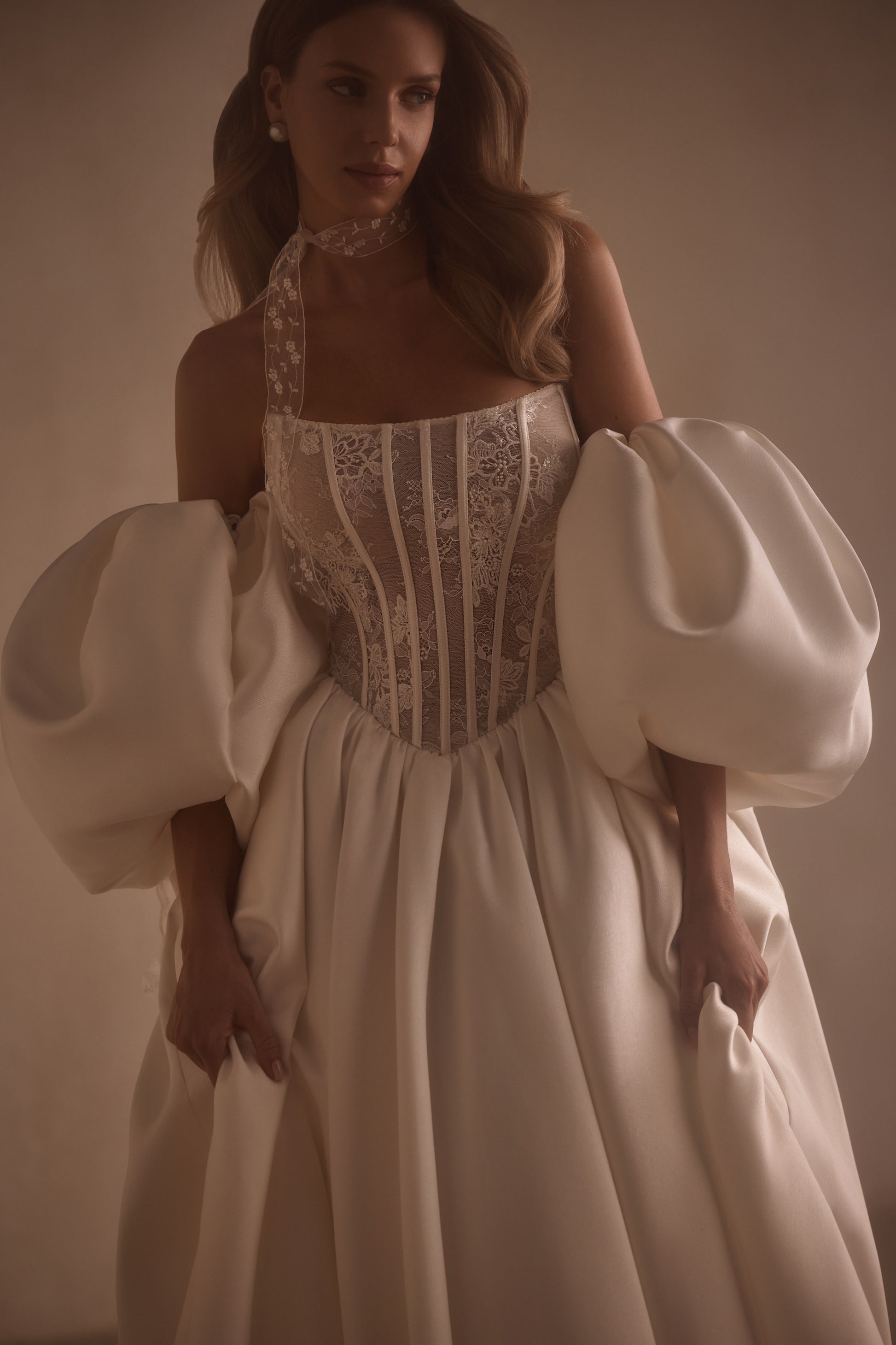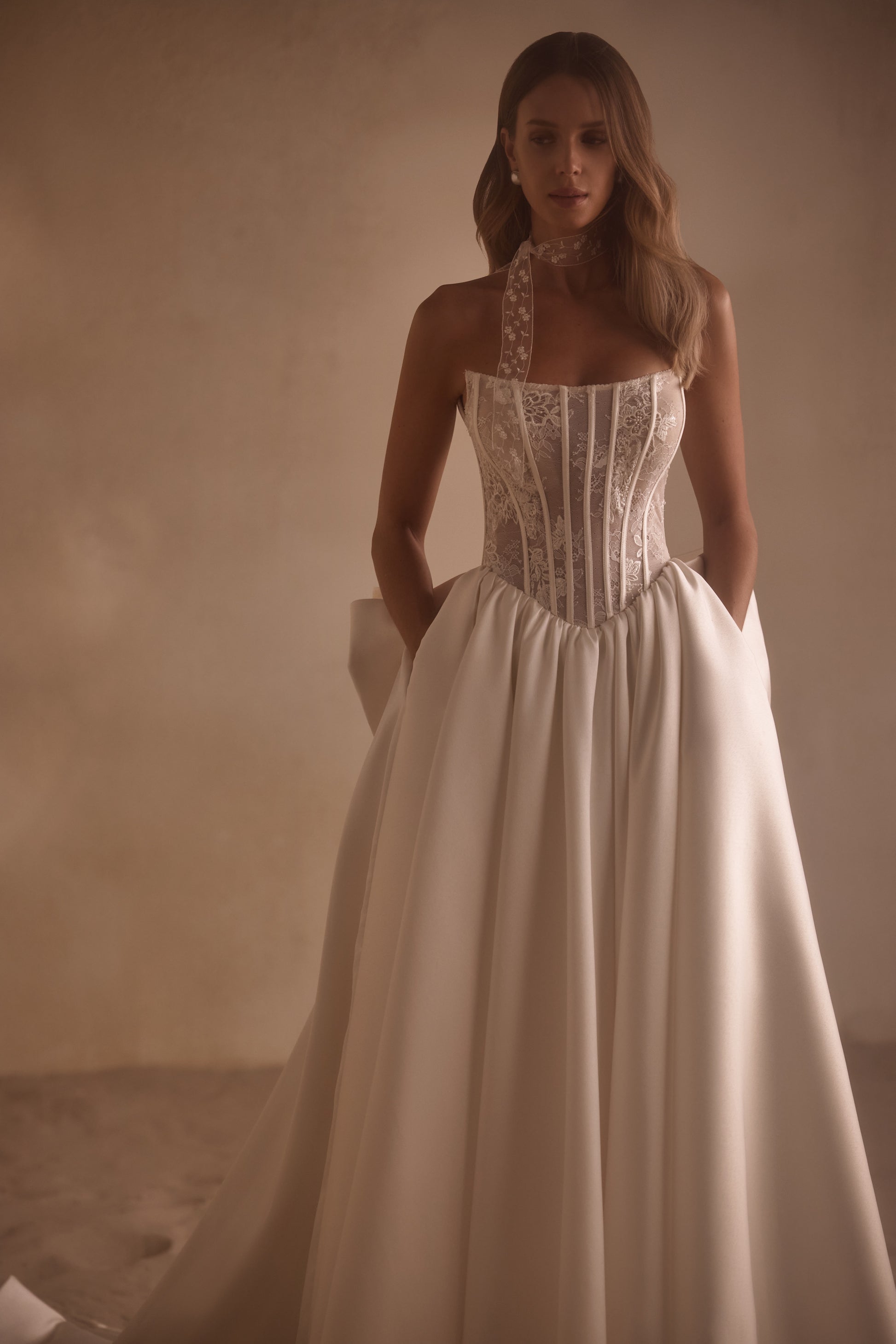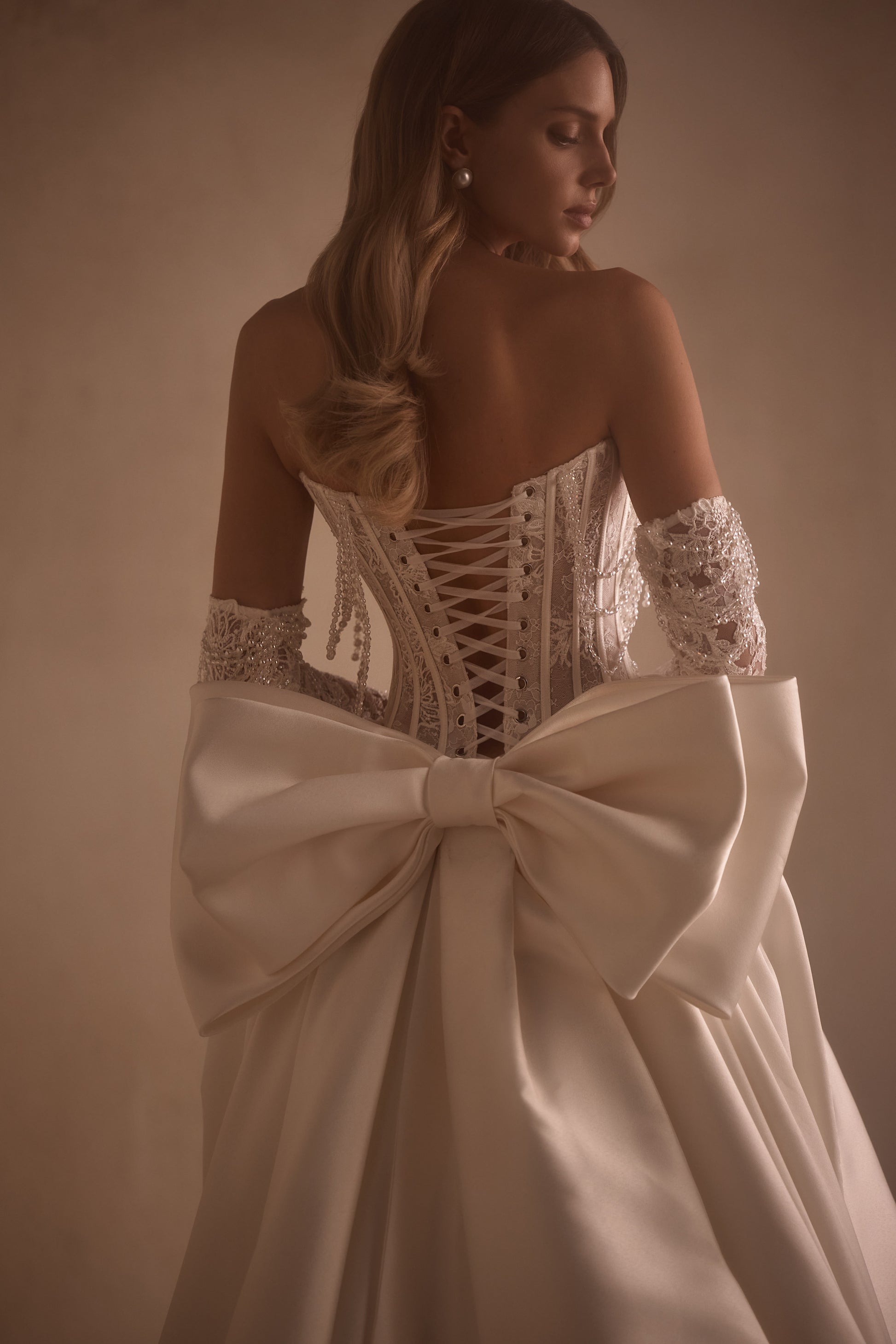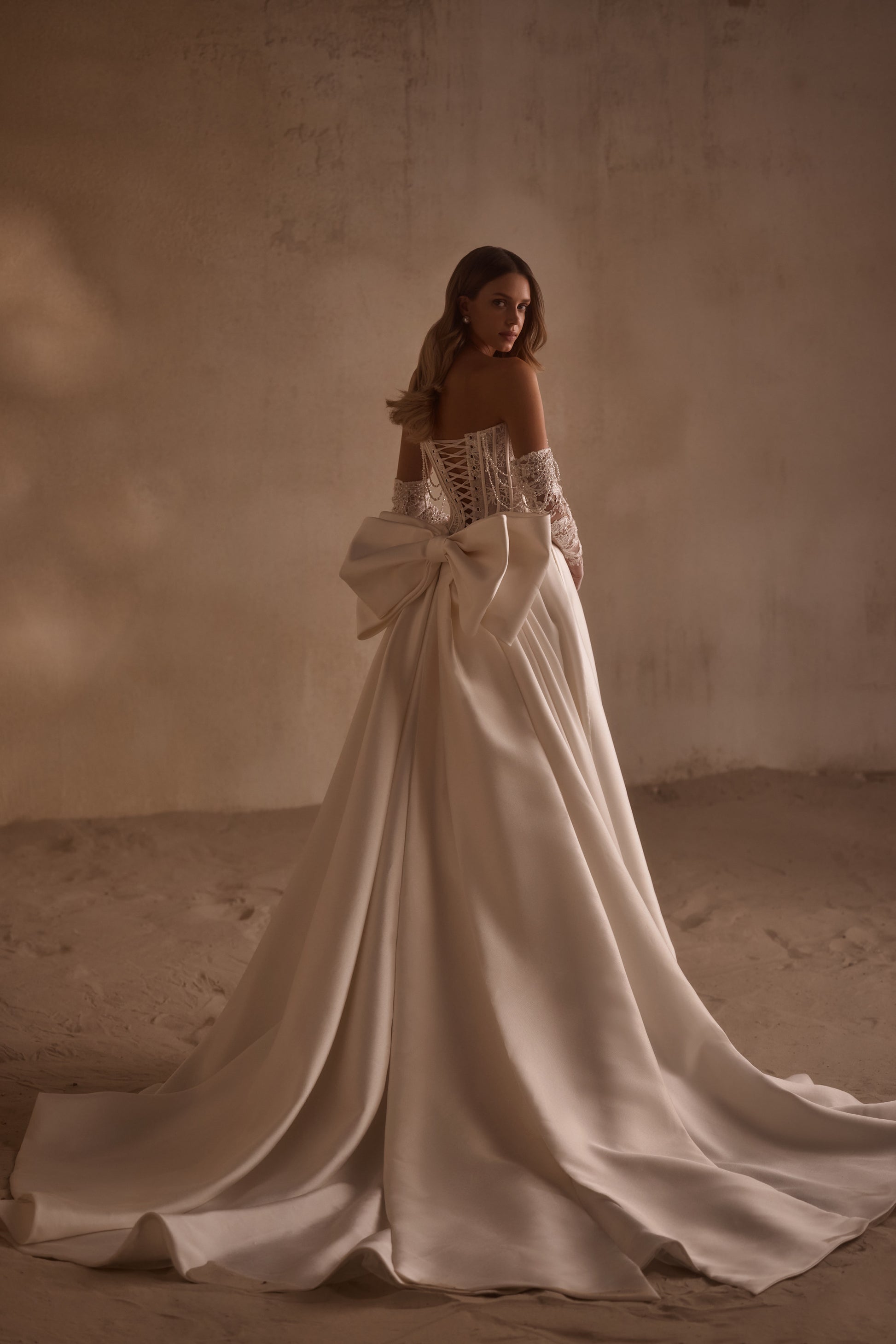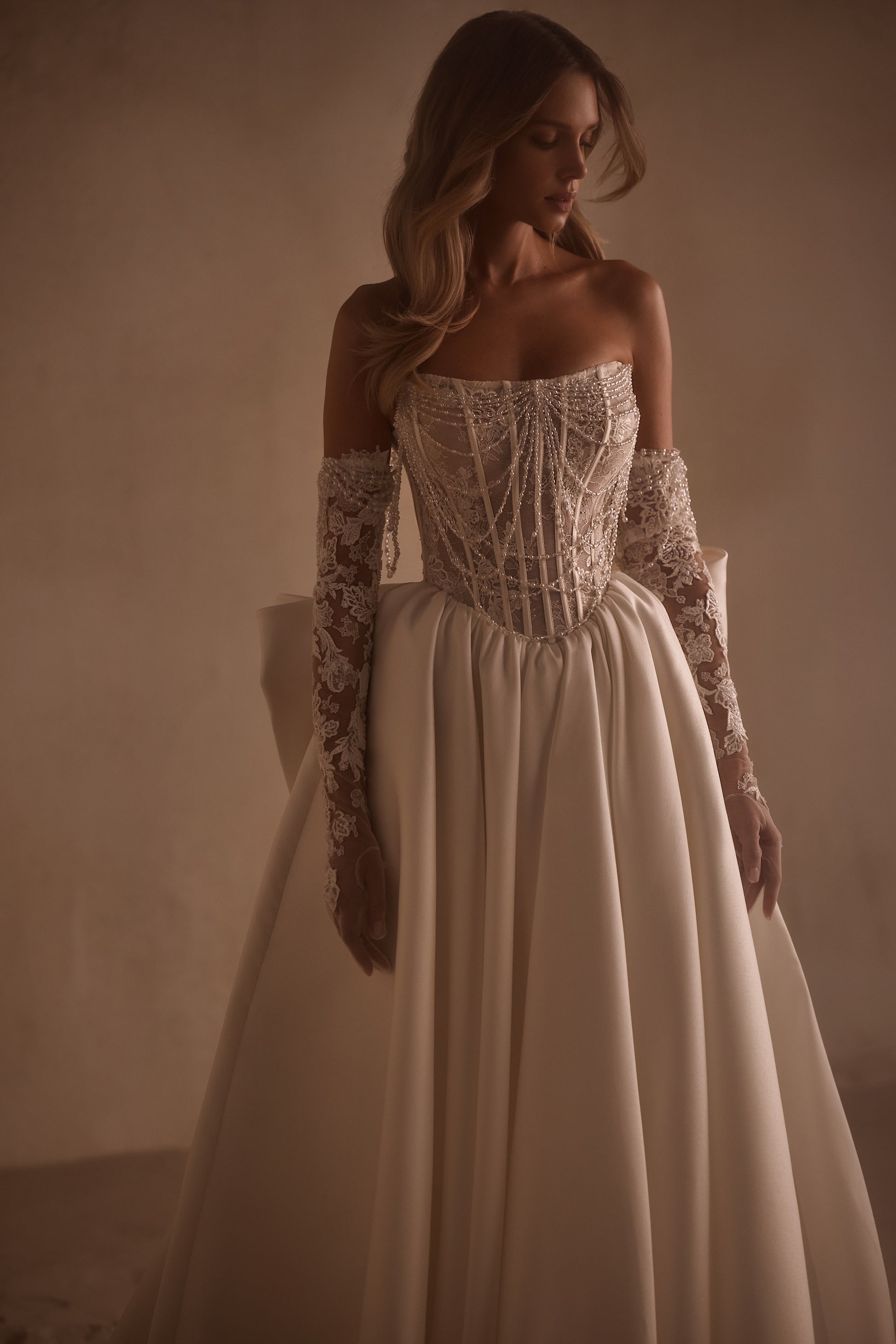 Ein elegantes Ballkleid ist aus glattem Mikado-Stoff gefertigt. Das schulterfreie Oberteil besteht aus Chantilly-Spitze und ist mit einer abnehmbaren Halskette aus Perlen und Kristallen verziert. Auf der Rückseite des Kleides befindet sich eine Schnürung. Der plissierte Rock geht fließend in eine Schleppe über. Der Look kann mit abnehmbaren Details vervollständigt werden – Spitzenhandschuhe, die mit Perlen verziert sind, eine ausdrucksstarke Schleife oder glatte Ärmel, die mit Knöpfen geschlossen werden.
