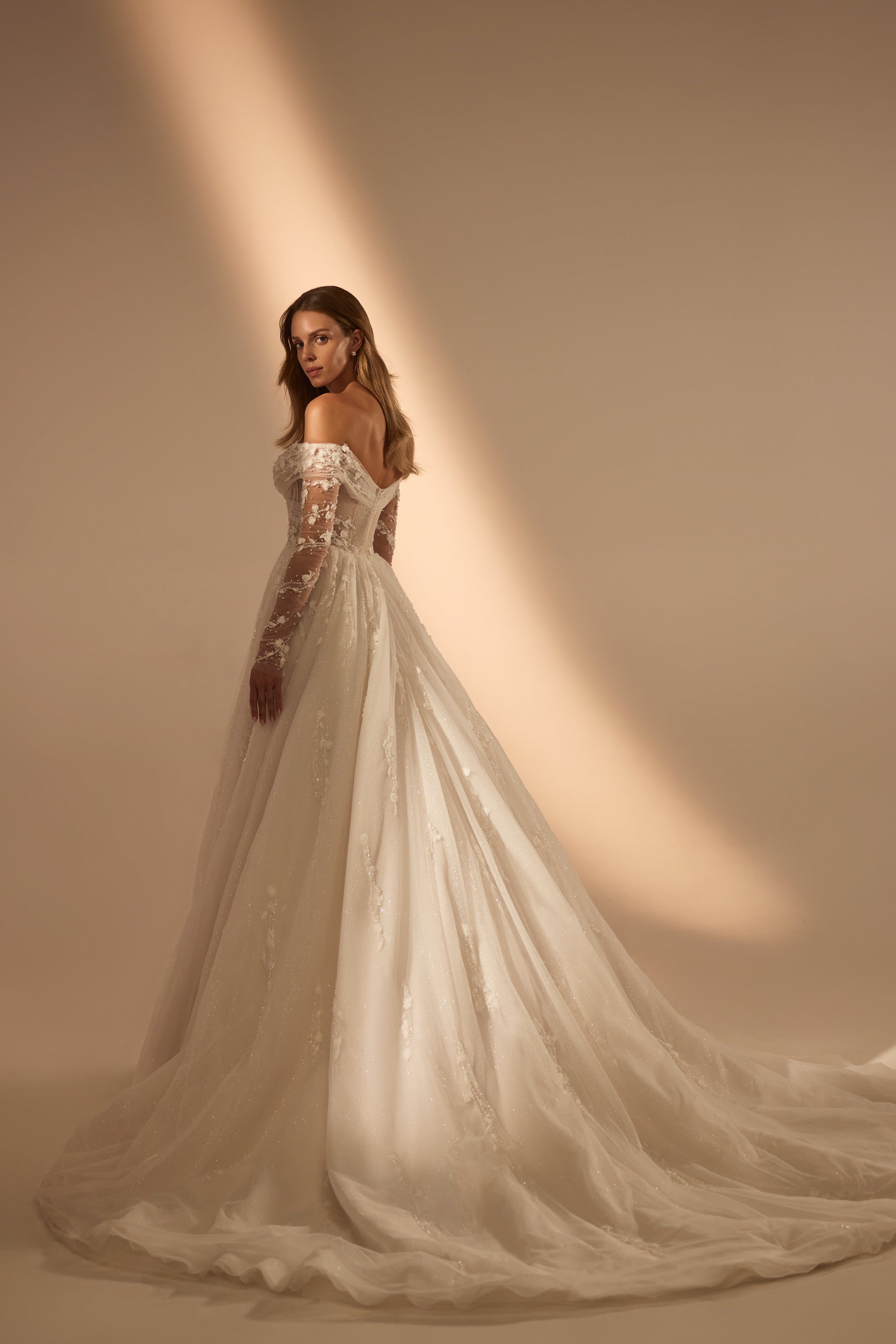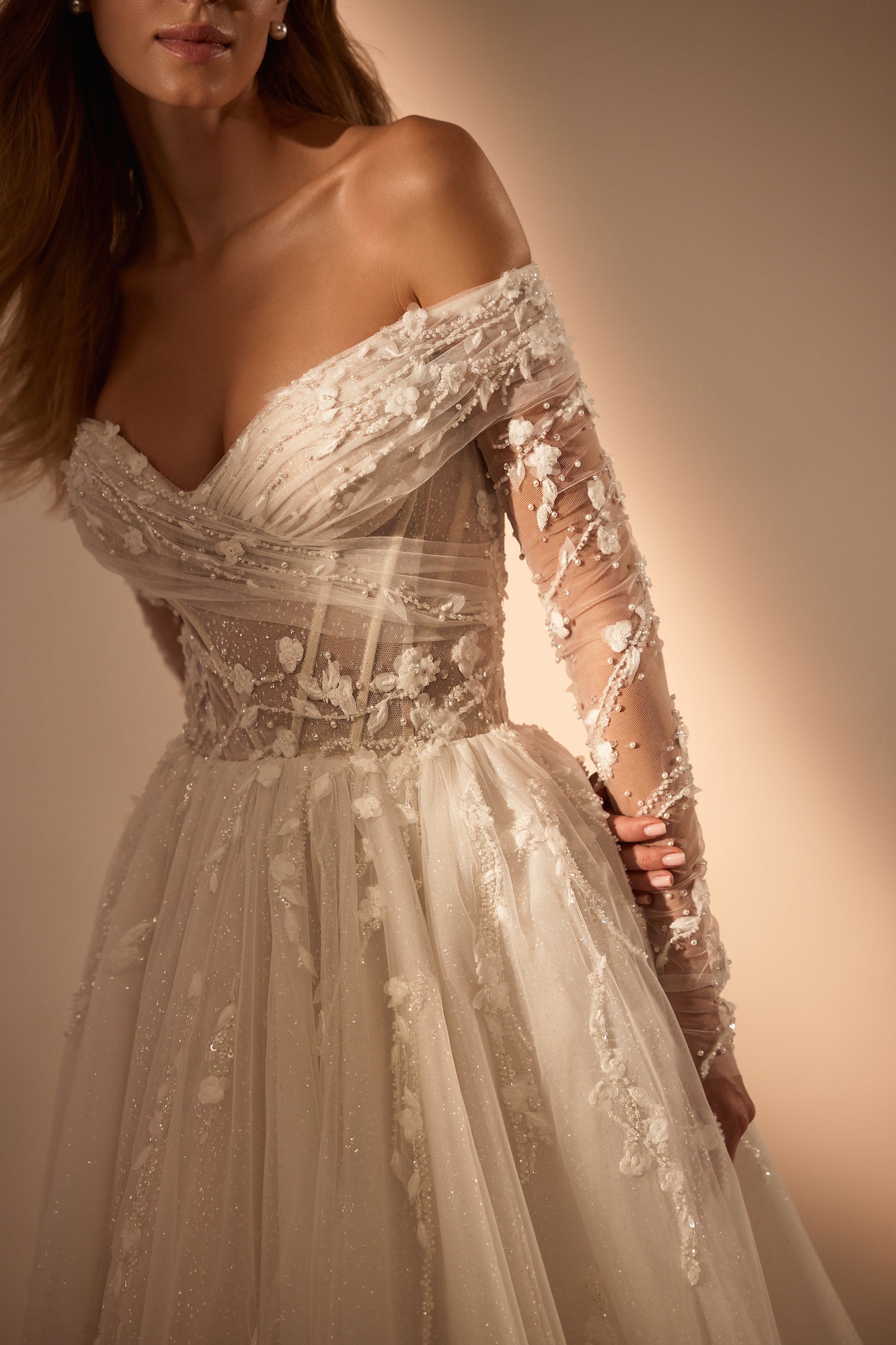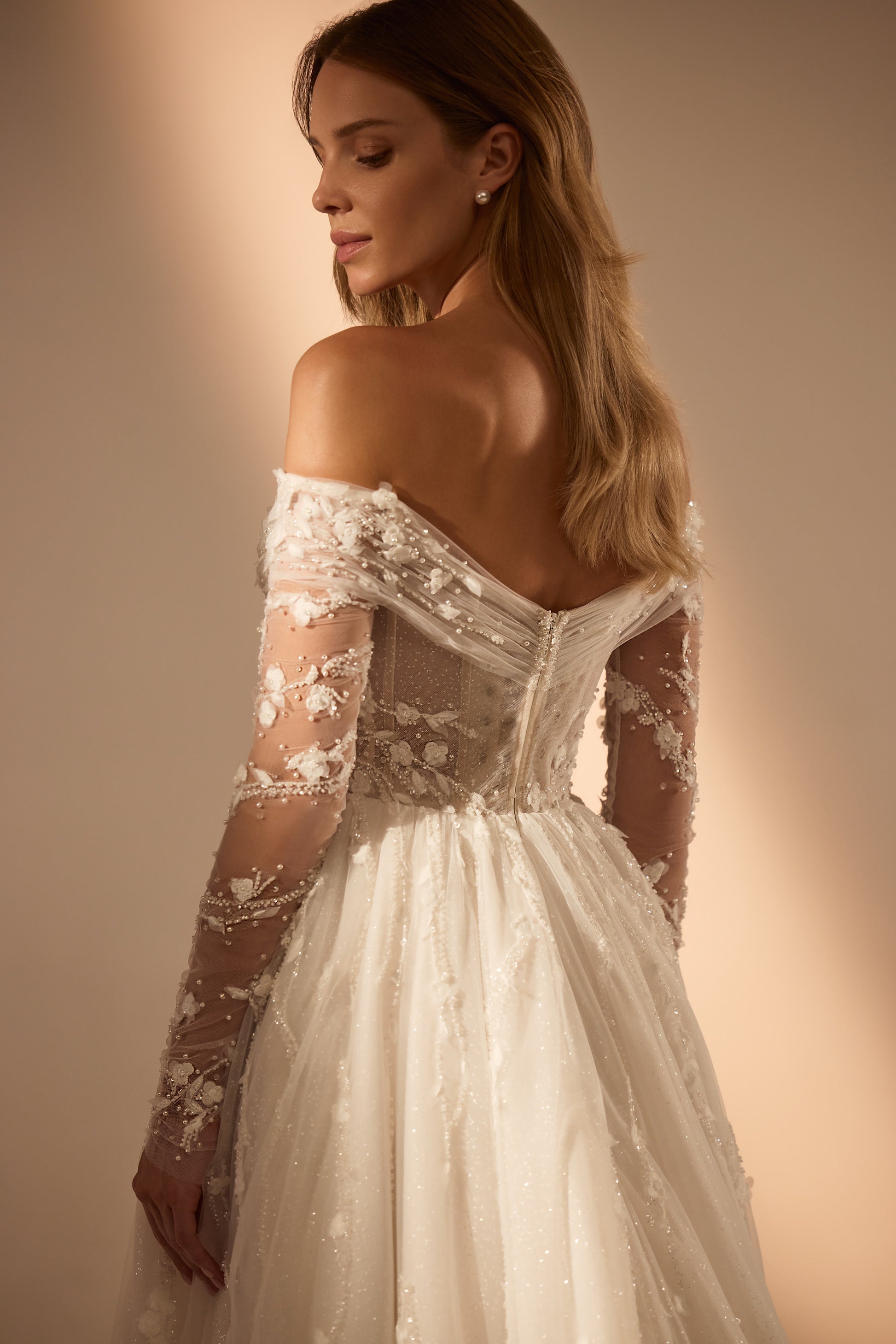 Ein traumhaftes nude-farbenes A-Linien-Kleid verfügt über ein schulterfreies Oberteil, das mit drapiertem Mesh, Pailletten und Spitzenblumen verziert ist. Es wird mit einem Reißverschluss geschlossen und besitzt eine innenliegende Schnürung. Der Rock ist aus Organza und schimmerndem Material gefertigt und mit Spitze, voluminösen Blumen und Pailletten geschmückt. Das Kleid hat eine lange Schleppe. Der Look kann zudem mit langen, abnehmbaren Ärmeln ergänzt werden, die mit Blumen und Stickereien verziert sind.