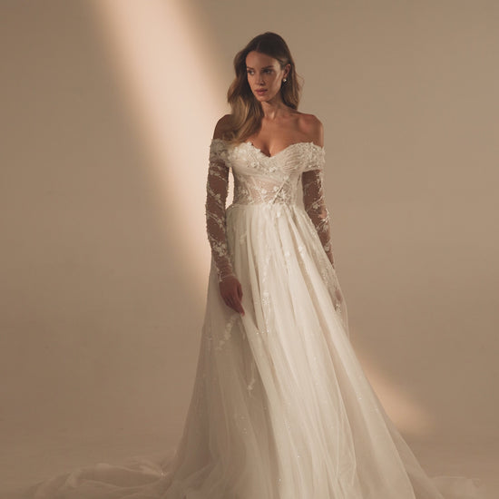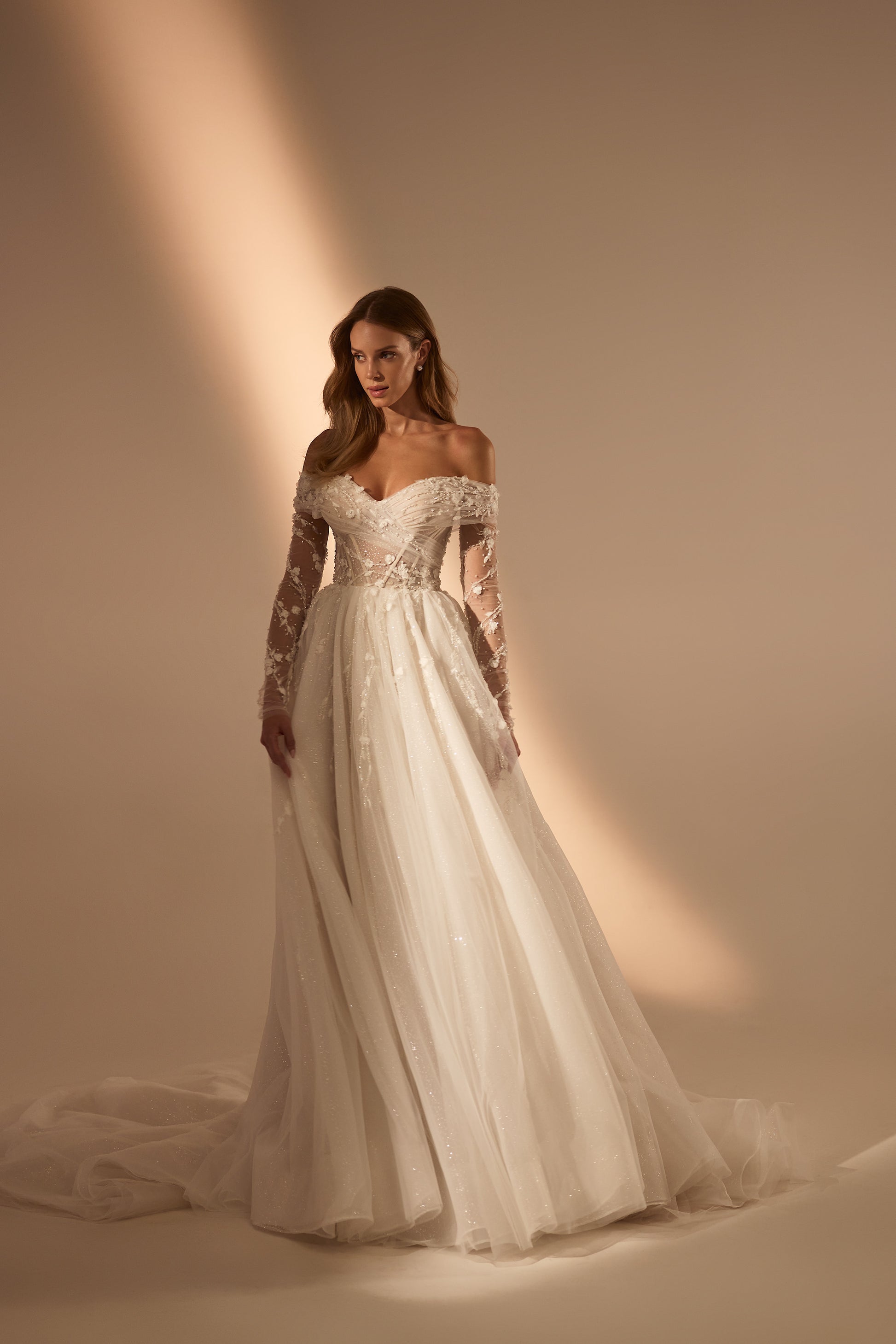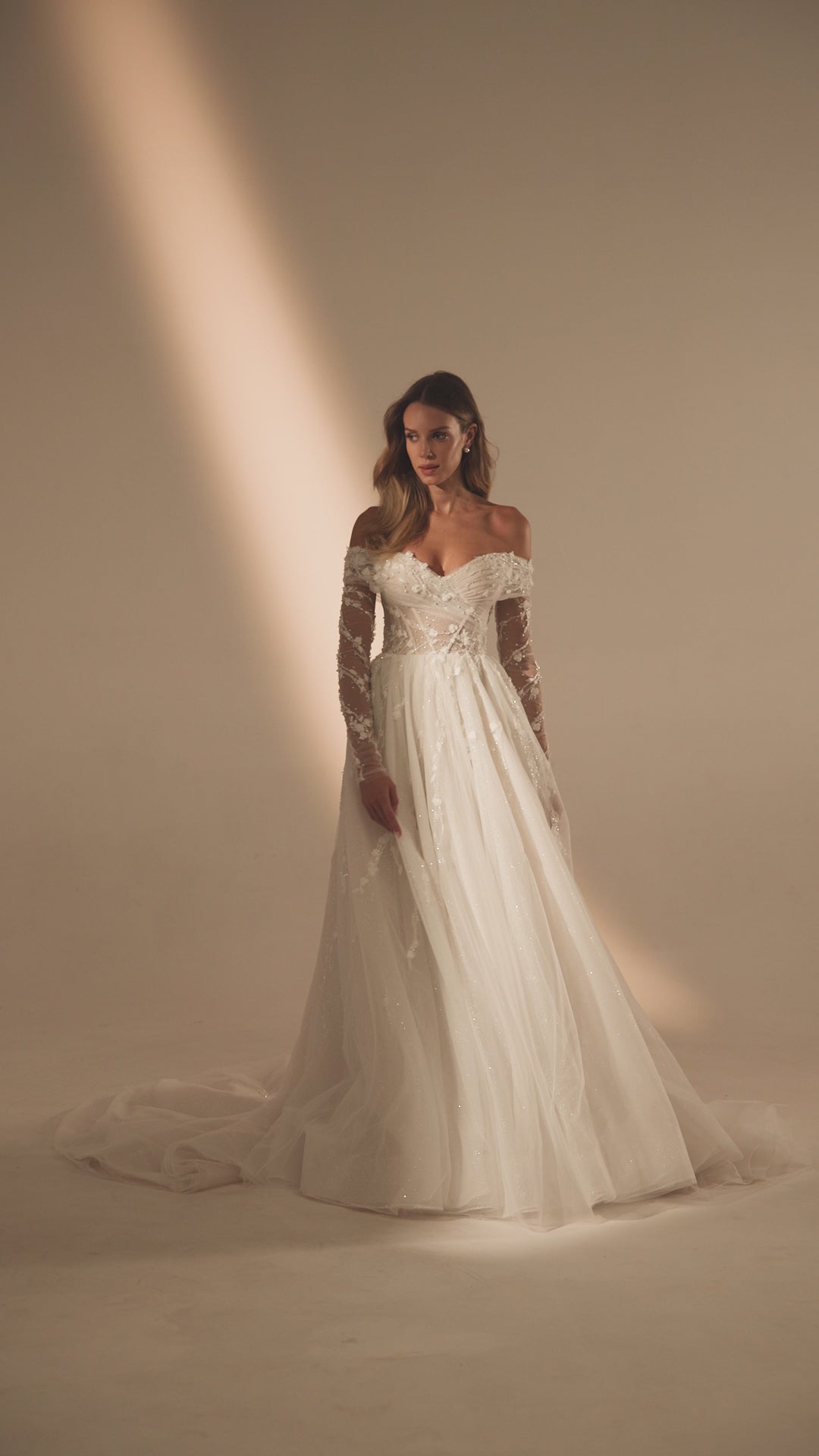 Ein traumhaftes nude-farbenes A-Linien-Kleid verfügt über ein schulterfreies Oberteil, das mit drapiertem Mesh, Pailletten und Spitzenblumen verziert ist. Es wird mit einem Reißverschluss geschlossen und besitzt eine innenliegende Schnürung. Der Rock ist aus Organza und schimmerndem Material gefertigt und mit Spitze, voluminösen Blumen und Pailletten geschmückt. Das Kleid hat eine lange Schleppe. Der Look kann zudem mit langen, abnehmbaren Ärmeln ergänzt werden, die mit Blumen und Stickereien verziert sind.