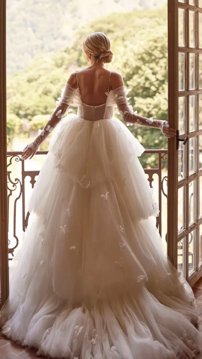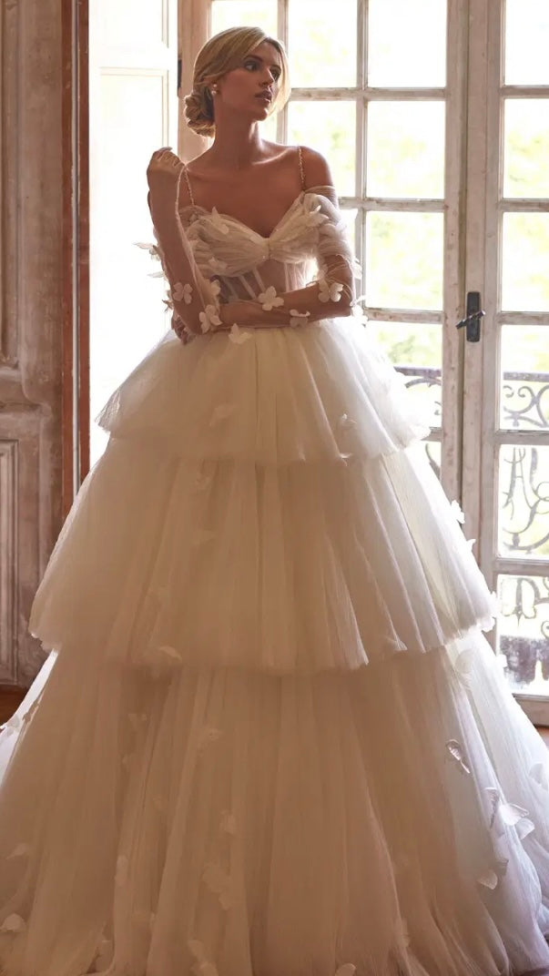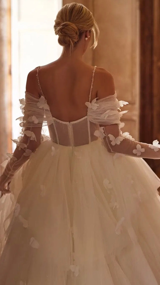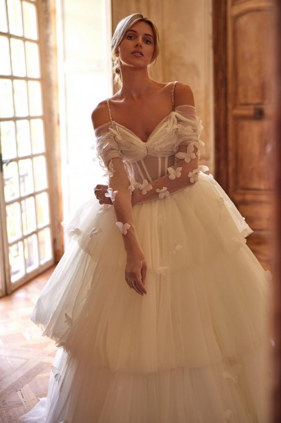 Ein romantisches Brautkleid aus plissiertem Mesh und Glitter. Der Rock ist mit Rüschen bestickt, das Korsett verfügt über herausnehmbare Cups, freie Schultern und feine, bestickte Träger. Es wird mit einem Reißverschluss geschlossen und hat zusätzlich eine innenliegende Schnürung. Das Kleid wird durch zarte Drapierungen und handgefertigte Stickereien ergänzt. Handgearbeitete 3D-Schmetterlinge aus Organza sind über das gesamte Kleid verteilt und verleihen ihm eine märchenhafte Ausstrahlung.