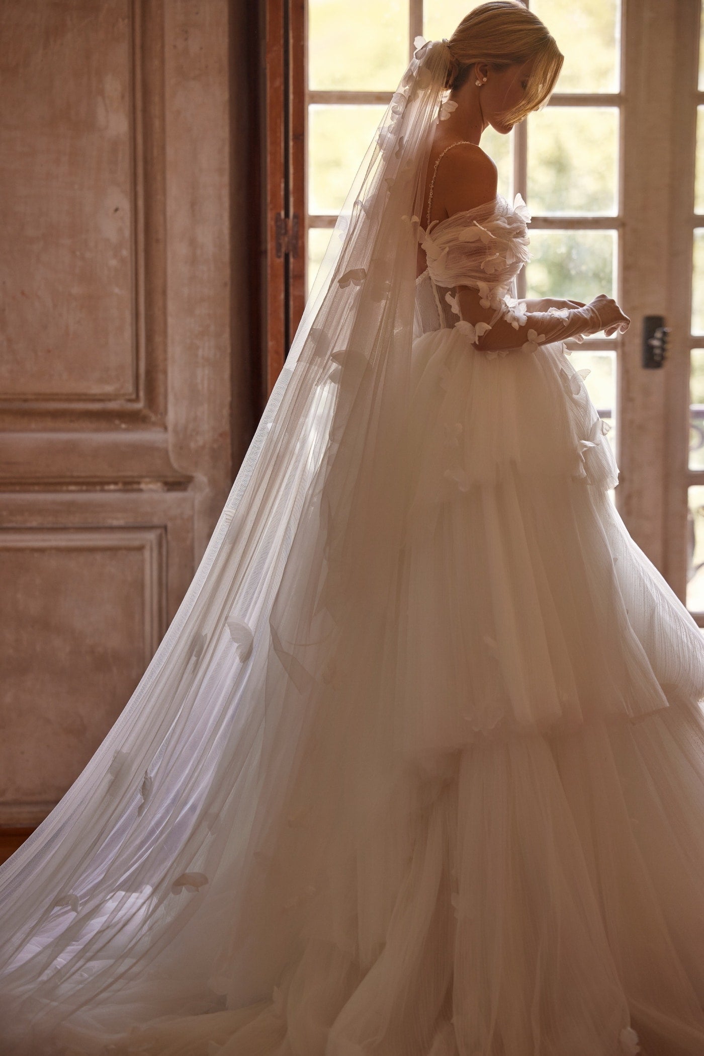 – einen Schleier, der ebenfalls mit Schmetterlingen und handgefertigter Stickerei dekoriert ist.