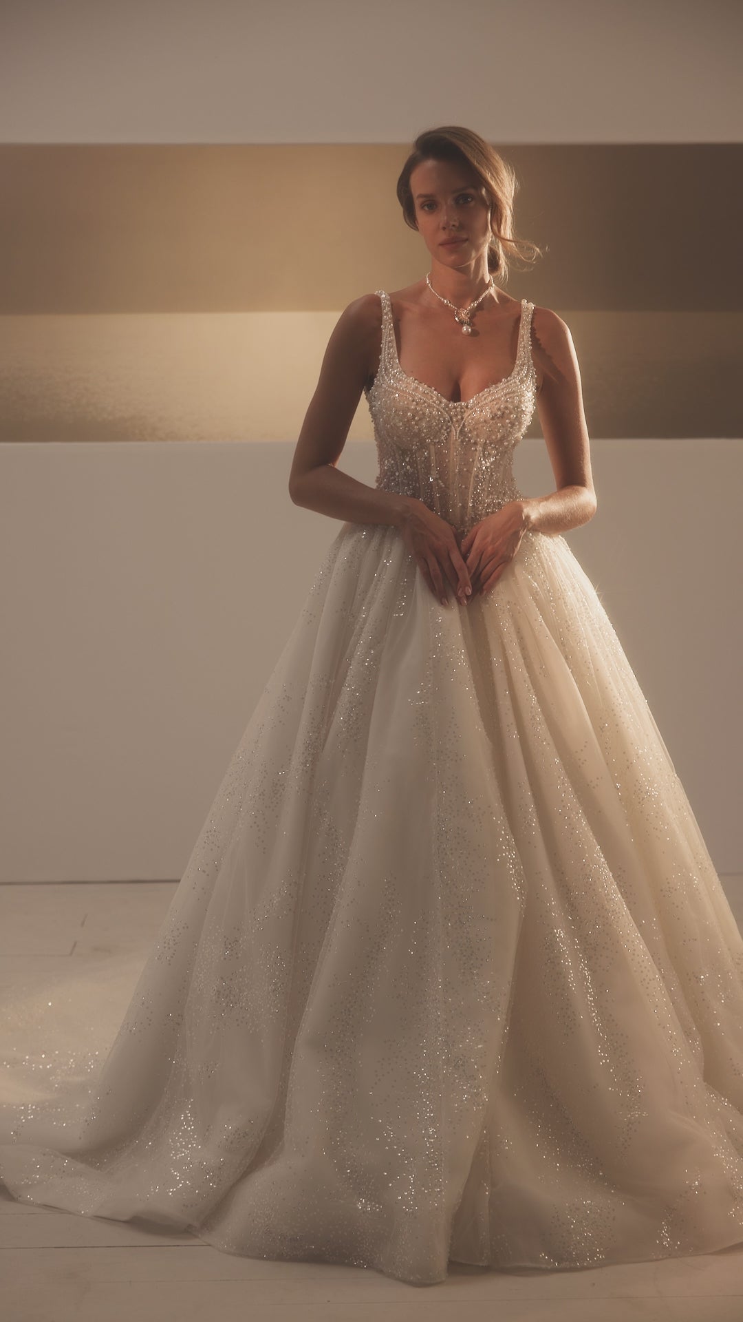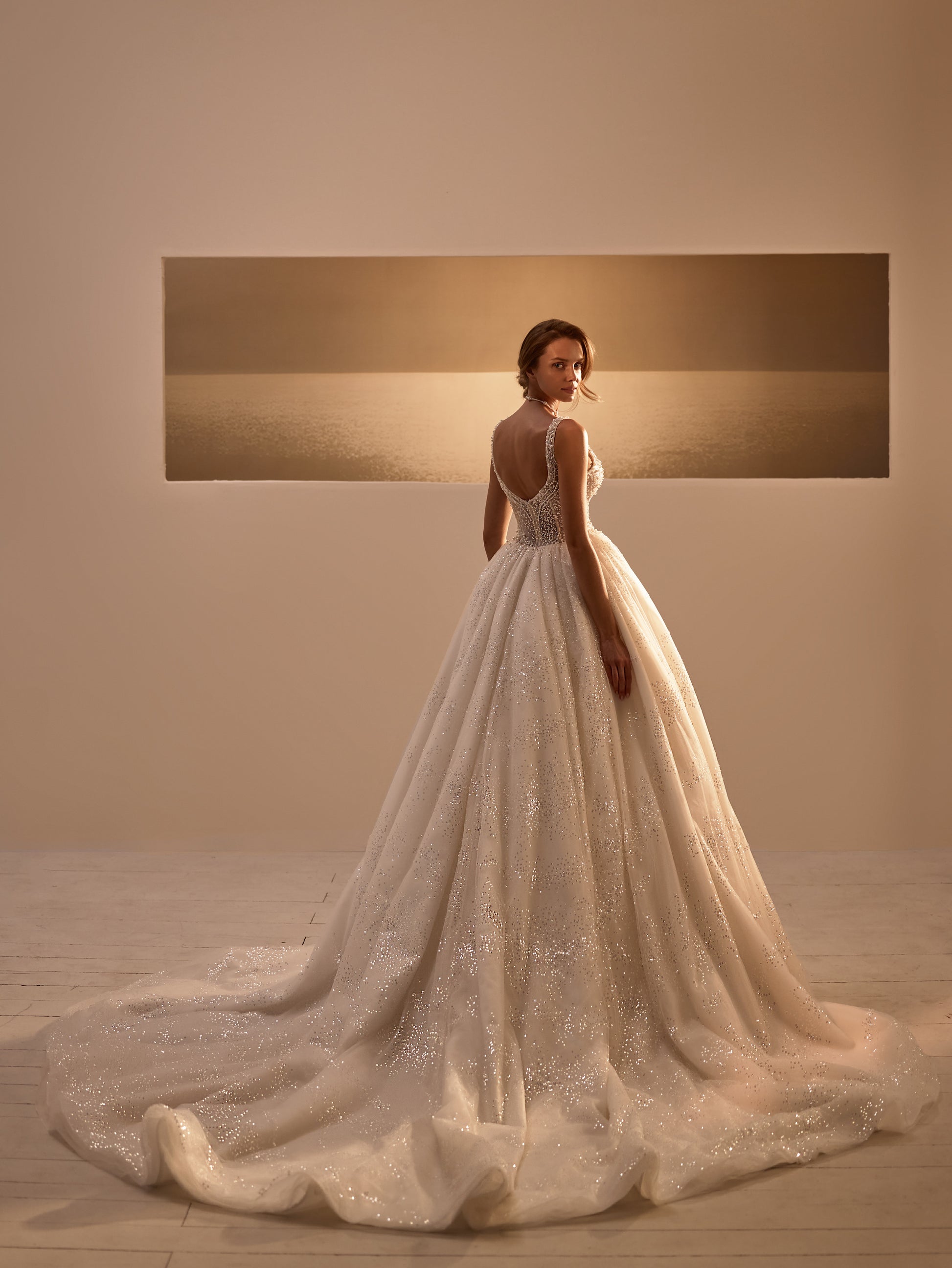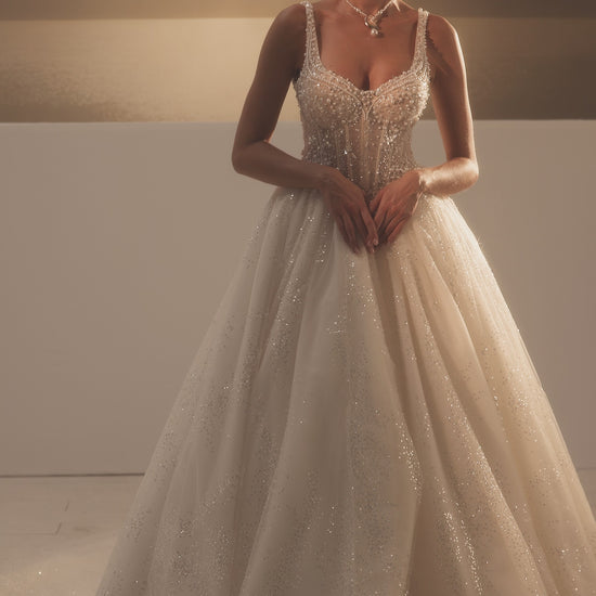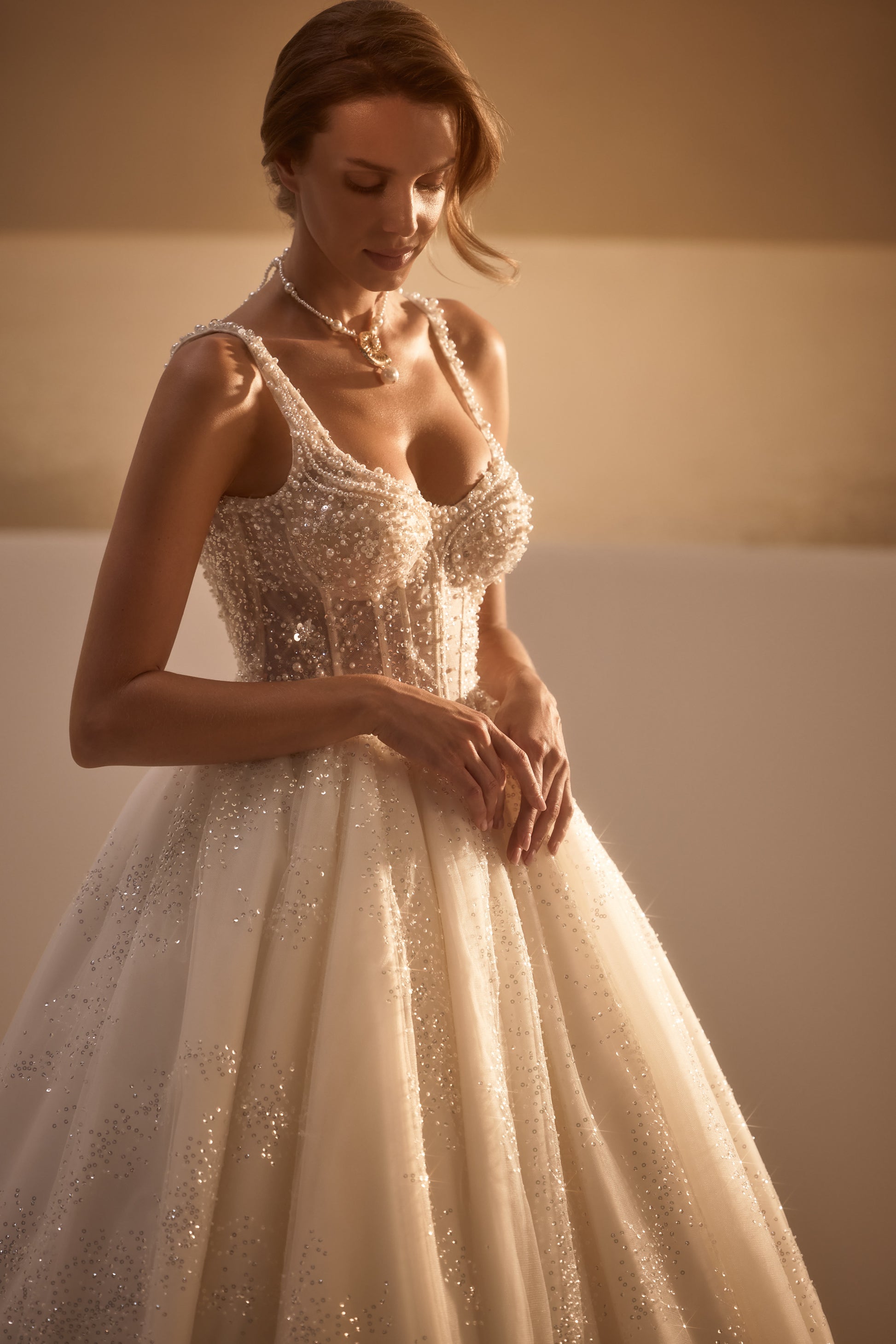 Ein luxuriöses, voluminöses Kleid ist aus Mesh gefertigt, der vollständig mit Pailletten bestickt ist. Das Oberteil mit einem prachtvollen Ausschnitt verfügt über Träger, einen Reißverschluss sowie eine innenliegende Schnürung. Es ist von Hand mit Perlen, Pailletten und Glasperlen bestickt. Der beeindruckende Rock funkelt intensiv und geht in eine lange Schleppe über.